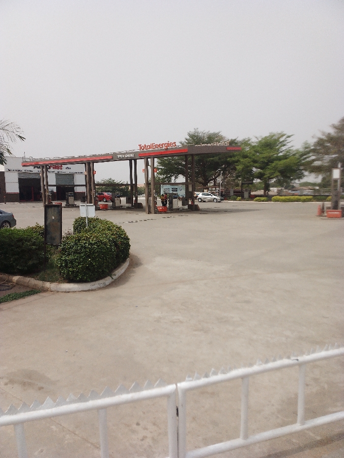 This image depicts a TotalEnergies gas station located in Jiru, Nigeria, under an overcast or hazy sky