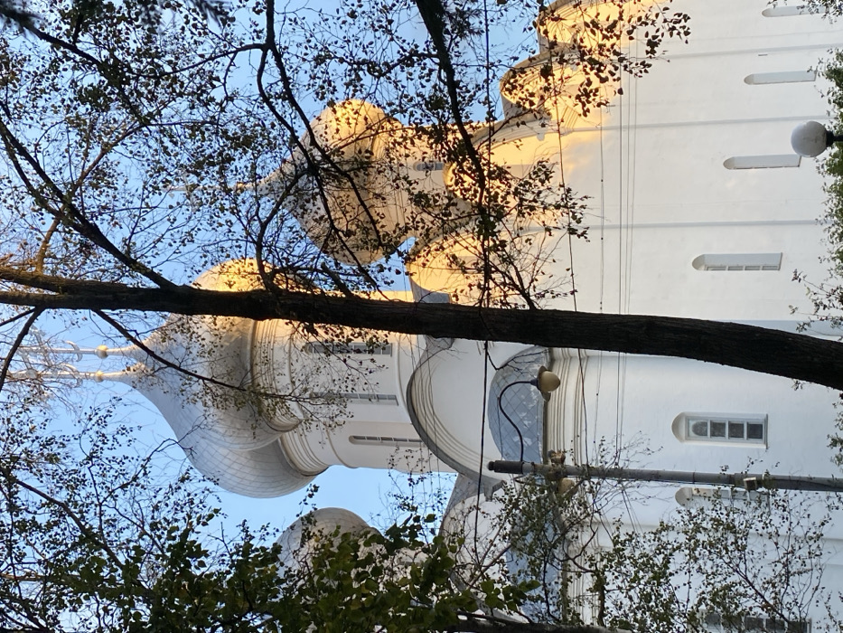 This image displays a section of the Saint Sophia Cathedral, located within the Vologda Kremlin in Vologda, Russia. The large, white-plastered stone structure features multiple metallic grey, onion-shaped domes, several topped with crosses, visible against a clear blue sky. Golden sunlight illuminates the right side of the cathedral and its eastern-facing domes, creating bright highlights. A prominent dark-barked tree trunk runs vertically through the center-right foreground, partially obscuring the cathedral. Other trees with green, sparse foliage frame the upper and side portions of the scene. In the lower-left quadrant, a grey utility pole with attached wires supports a curved street lamp with a light-colored shade. A portion of a spherical street lamp is also visible in the lower-right foreground. The cathedral walls exhibit several arched, recessed windows. No individuals or specific activities are depicted within the frame.