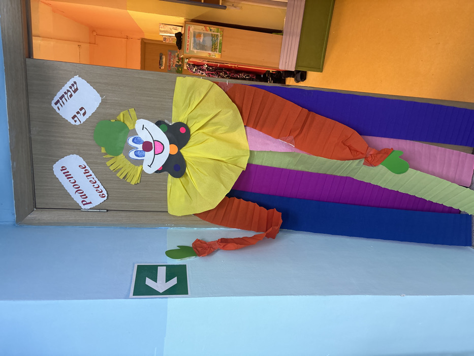 An indoor scene depicts a light brown wooden door and an adjacent light blue wall, decorated with a large, colorful paper clown figure. The clown features a cardboard head with a smiling face, blue eyes, a red nose, a black polka-dot bow tie, yellow shredded paper hair, and a green paper hat. Its body comprises vertical strips of blue, purple, light green, pink, and orange crepe paper. A ruffled yellow paper collar encircles its neck, and two orange ruffled paper arms extend laterally; the left arm holds a green paper carrot shape. Above the clown's head, two white scalloped paper signs are attached to the door. The left sign displays "Радость веселье" in red Cyrillic script (meaning "Joy Fun/Merriment"), and the right sign displays "שמחה כיף" in black Hebrew script (meaning "Joy Fun"). To the left of the door, on the light blue wall, a green square sign with a white left-pointing arrow is visible. The door is partially ajar on the right, revealing a glimpse of an interior room with a bright yellow floor, orange walls, a light wooden cabinet holding various items, and a low, dark green bench or storage unit. This setting suggests a Jewish educational institution or community center in Moscow, Russia.