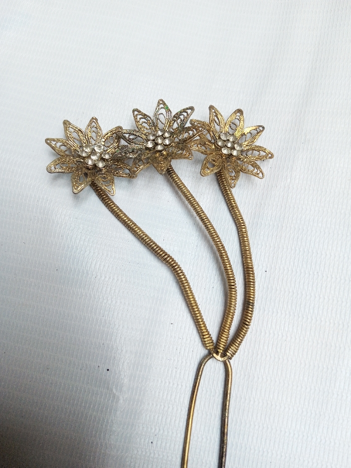 The scene, located in Qarabucaq qəsəbə, Azerbaijan, displays three ornamental hairpins on a light-colored, subtly textured surface. Each hairpin features a gold-toned, filigree flower-shaped head, centrally embedded with a cluster of small, clear, faceted stones. These three flower heads are individually mounted on coiled, gold-toned metal stems, which converge at their base to form a U-shaped, two-pronged hairpin structure. The metal components display signs of oxidation, wear, and minor discoloration, including a small green mark on one of the flower heads. The surface beneath the items is plain and exhibits slight creasing. No human subjects or active interactions are present.