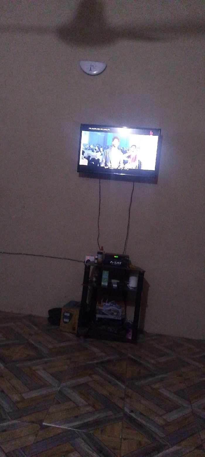 The scene depicts an interior room, likely a private residence, within the city of Unknown, Unknown. The walls are uniformly light brown. A white, half-moon-shaped wall-mounted fixture with a dark Eiffel Tower silhouette emblem is visible on the upper wall. A wall-mounted black flat-screen television displays a broadcast showing two men in the foreground against a blurred background of an indoor gathering; text, including "A-SAT", is visible on the screen. Two black cables extend downwards from the television. Beneath the television, a dark, open-shelf unit is present. Its top shelf holds a black A-SAT receiver displaying "20:31", a white power strip with a red indicator light, and two small bottles. Other items are stacked on the lower shelves. To the left of the shelf unit, a yellow/beige electrical device rests on the floor. The floor is covered with multi-toned tiles arranged in a chevron or herringbone pattern. No individuals are physically present in the depicted environment.