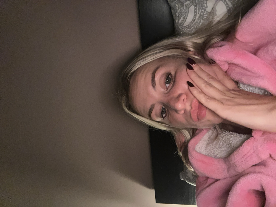 A woman with blonde hair wearing a pink bathrobe lies on her side against a pillow. She rests her face on her hand, which has dark polished fingernails. The background is a dark color. Her skin tone appears fair.