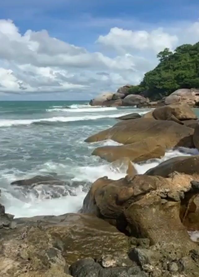 coastal scene with waves crashing against large rocks. The sky is blue with scattered white clouds. The water is a light turquoise color, and small waves roll towards the shore. A rocky coastline is visible in the foreground, with several large, smooth boulders partially submerged in the water. In the background, a hill covered with lush green vegetation rises from the shoreline. The camera appears to be stationary, capturing the natural beauty of the scene.