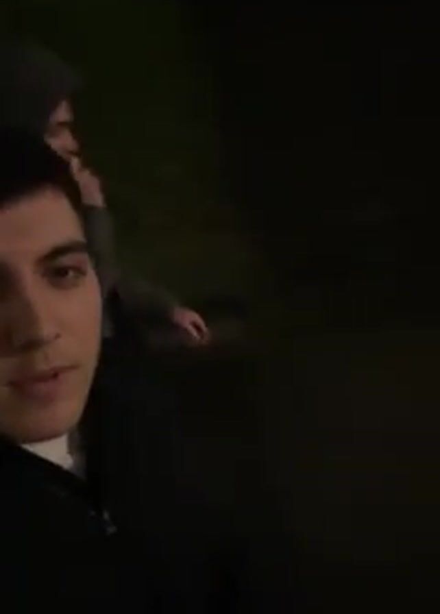Two individuals are present in the video. The first person, who is holding the camera, is a young male with short dark hair, wearing a dark jacket over a white shirt. The second person, standing slightly behind and to the side of the first, is wearing a grey hoodie, pulled up over their head. The background is dark and appears to be outdoors at night, with what seems to be a street light and some greenery visible. The first person is looking at the camera and appears to be speaking. The second person is obscured by darkness but appears to be smoking.