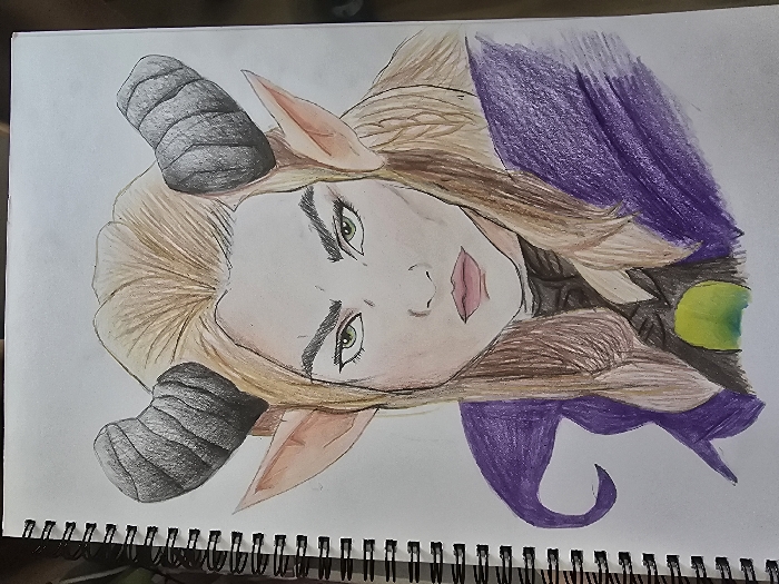 - "The image displays a color pencil drawing of a fantasy-genre character, rendered from the chest up on a white page within a spiral-bound sketchbook" by FM-AvAPu1, licensed under CC BY 4.0