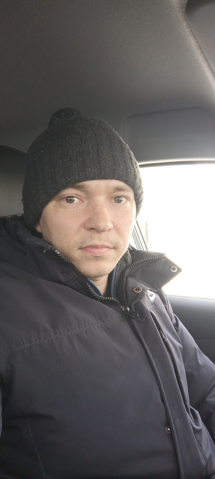A mid-shot selfie captures an adult male seated within the interior of a vehicle. The individual, possessing a light skin tone and brown eyes, wears a dark grey ribbed knit beanie cap with a small bobble and a dark blue or black winter jacket, partially zipped, revealing a grey fleece collar underneath. A faint stubble is present on his chin and upper lip. He maintains a neutral expression, looking directly into the camera. The vehicle's grey fabric headliner is visible in the upper portion of the frame, and a bright, overexposed window is present on the right side, suggesting strong ambient light or sunlight. No specific landmarks or distinguishing features are visible to determine the exact location within the city of Chaikovsky, Russia, although the individual's attire indicates cold weather conditions.