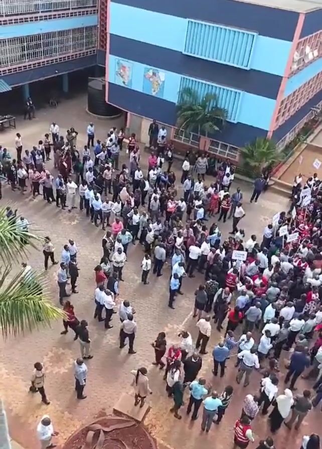 large group of people gathered in a courtyard between buildings. Many are wearing light-colored shirts. Some people are holding signs. The footage is taken from a high vantage point, looking down on the crowd. The buildings are multi-storied and painted in blue and peach colors. Some vehicles are visible on a road outside the courtyard.