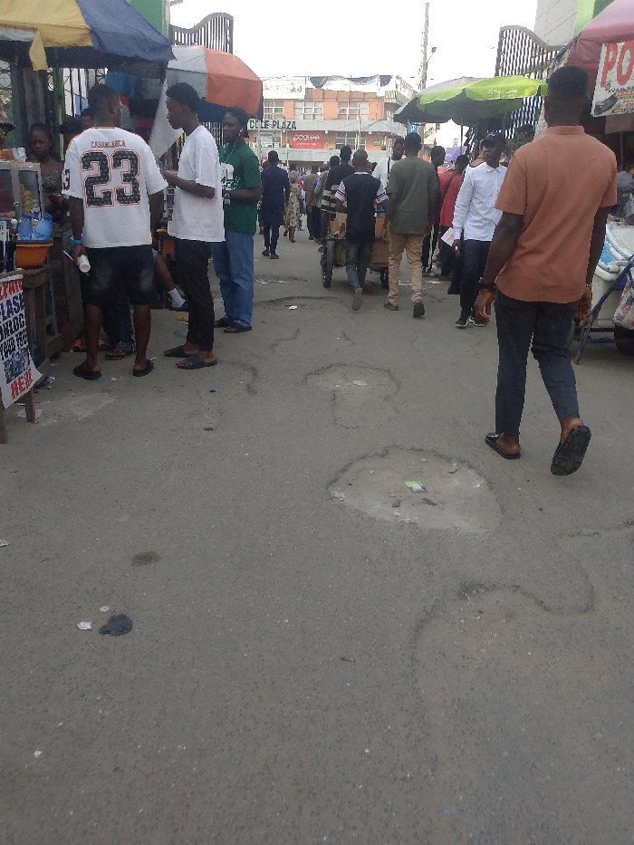 A bustling street scene shows pedestrians walking amidst open-air stalls with colorful umbrellas. The road is worn, showing potholes and scattered debris. A building with "CCLE PLAZA" prominently displayed is in the background. People are dressed in casual clothing, and some seem to be shopping or conversing. A pushcart being pulled through the crowd adds to the dynamic atmosphere.
