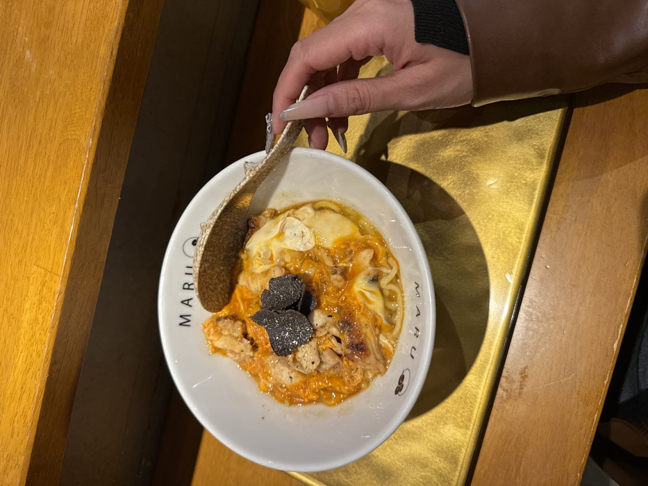 A top-down shot reveals a bowl of ramen with truffle shavings and what looks like fried chicken. An ornate spoon rests inside the bowl. A hand with long, light-colored nails holds the spoon, positioned over the bowl. The bowl sits on a gold surface, part of a wooden table with contrasting light and dark sections. A sleeve of a leather jacket is visible.