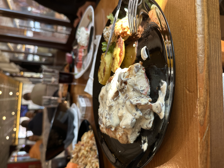 The image portrays an interior scene from a restaurant in Dimitrovgrad, Bulgaria. In the foreground, a black, glossy plate is positioned on a light brown wooden table. The plate contains a primary dish consisting of a piece of meat, likely pork or chicken, covered in a creamy white mushroom sauce with distinct mushroom slices visible. Accompanying this are several slices of pan-fried yellow potatoes, a small cluster of green leaf lettuce, and a spherical fried item with a silver four-tined fork partially inserted. A small, white, curved object rests on the plate to the right of the main meal. The wooden table displays visible grain and minor surface wear. To the immediate left of the main plate, a black bowl holds a dish resembling a rice or noodle preparation with visible vegetable pieces. Beside this bowl, a white and blue cigarette packet and a white paper napkin are present. Further into the midground, a clear glass filled with a dark liquid, possibly cola, is visible. Another white oval plate, appearing to be at a separate place setting, displays remnants of food including a red item, a white creamy substance, and a knife. The background is heavily blurred, revealing multiple indistinct human figures seated at tables. These individuals are not clearly identifiable. Numerous circular overhead light sources are visible as bright bokeh, illuminating the restaurant space. Vertical structural elements, possibly window frames, are discernible on the right side of the frame. The overall environment suggests a casual dining setting.