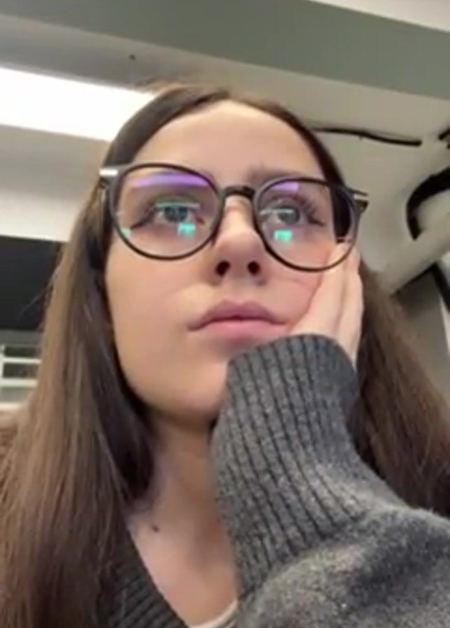 young woman with long brown hair wearing black framed glasses and a gray sweater. She is resting her face on her hand and looking upwards with a somewhat bored or contemplative expression. The background includes a fluorescent light fixture and some blurred out objects that appear to be part of an office or institutional setting. The camera appears to be held at a low angle looking up at the subject.