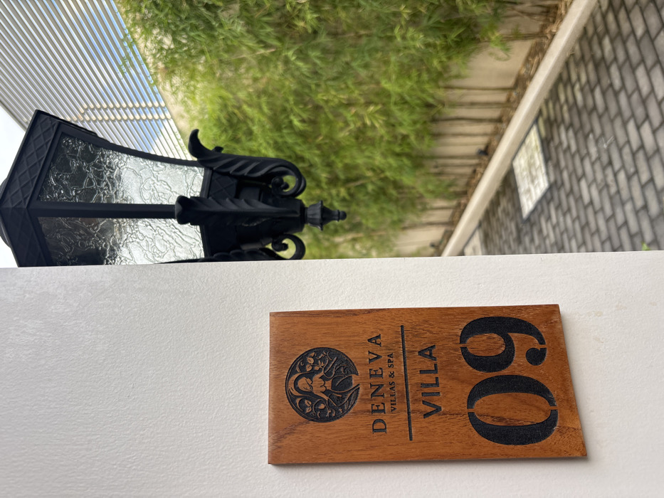 The scene depicts an exterior view of Villa 09 at Deneva Villas & Spa in Kerobokan, Indonesia, during daylight hours. A rectangular wooden sign is prominently displayed on a textured white wall in the left foreground. The sign features a dark engraved circular emblem at the top, depicting a stylized female figure with foliage, beneath which are the words "DENEVA VILLAS & SPA." A horizontal line separates this from the word "VILLA," followed by large, black, stenciled numerals "09" at the bottom. To the right of the wall, an ornate black metal lantern with textured glass panels hangs, partially obscured by the wall. Beyond the lantern and the wall, a paved pathway composed of grey rectangular bricks extends into the background. A narrow, light-colored concrete curb or border runs along the right side of this pathway, adjacent to a dense screen of tall, slender green bamboo plants. In the upper right background, above the bamboo, a section of a building with horizontal louvered architecture is visible against a bright sky. A square metal utility grate is visible on the paved pathway in the mid-ground.