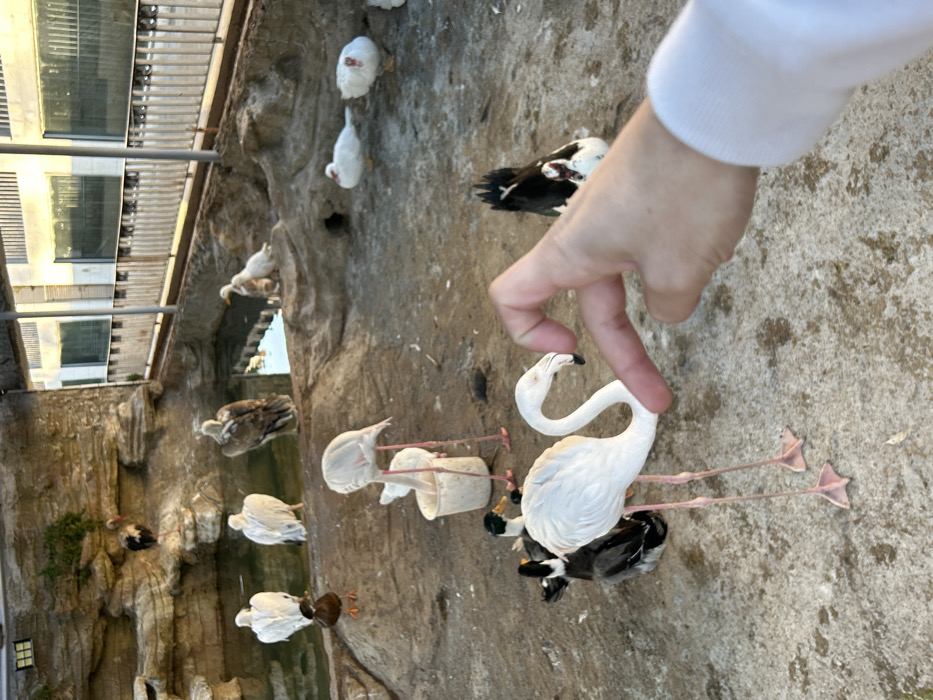 This image depicts a man-made animal enclosure in Barza Municipality, Syria. The scene features a concrete or packed dirt ground, a central pond with rocky edges, and artificial rock formations on the left. In the background, a modern building with reflective windows is visible beyond a metal fence. Numerous birds populate the enclosure. In the immediate foreground, a fair-skinned human hand, extending from a white sleeve, forms a heart shape with its thumb and index finger. This heart shape is positioned directly in front of and partially around the head of a tall, slender white flamingo with pinkish legs, which stands facing left. To the immediate right of this flamingo are two dark-feathered ducks with white markings. Further back, another white flamingo is seen with its head submerged in a white plastic bucket. Around the pond, various other birds are present: two large, predominantly white wading birds (possibly pelicans) stand near the water on the left, next to a smaller dark brown duck. A large, brown, possibly a vulture, bird stands on a raised rock near the pond's center. Another dark-feathered bird (possibly a stork) is perched on the upper rock formation on the far left. On the right side of the enclosure, several white ducks are scattered on the ground, and two lighter-colored ducks are near the water's edge.