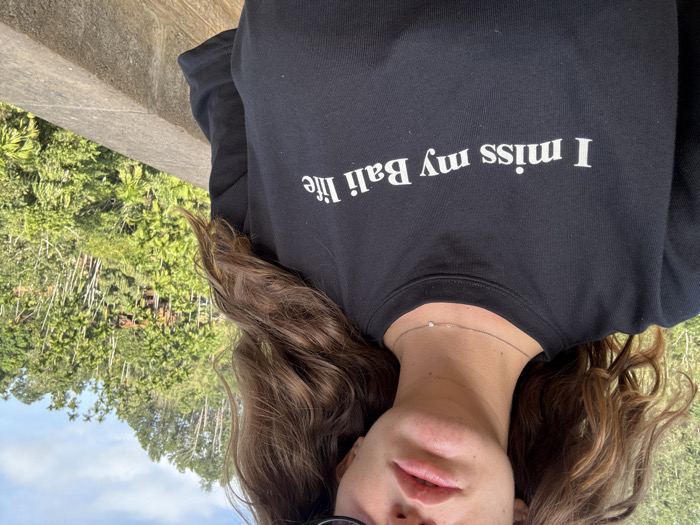 A person wears a black sweatshirt with the words "I miss my Bali life" printed in white. The individual has brown hair and a delicate necklace. In the background, there's a lush, green landscape suggesting a tropical environment with tall trees. Part of a stone structure appears in the upper left corner. The image is rotated counterclockwise.