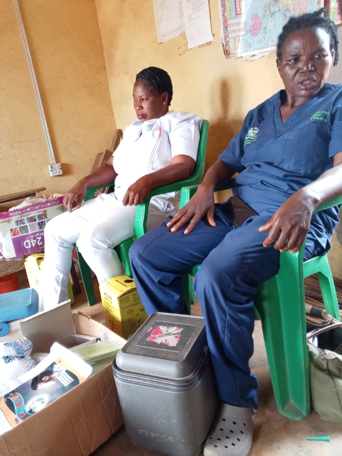 Two adult females are seated in green plastic chairs within an indoor setting, identified as a room in Markurdi, Nigeria