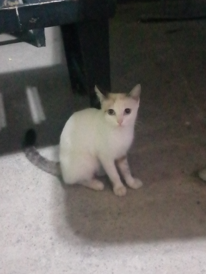 - "A light-furred cat with a gray tail sits alertly on a concrete surface" by FM-Q5qB73, licensed under CC BY 4.0
