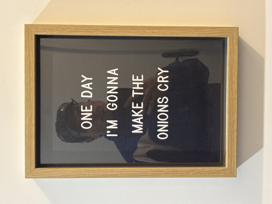 A framed message board is centered on a light-colored, plain wall. The frame is rectangular with a light brown, possibly wooden, finish. The board itself has a dark, reflective surface displaying white, uppercase text that reads: "ONE DAY I'M GONNA MAKE THE ONIONS CRY". A reflection of a person is visible on the dark surface of the board, occupying the central portion of the frame. The reflected individual is holding a dark-colored smartphone, positioned as if taking the photograph. The person wears a dark baseball cap with sunglasses resting on its brim, a dark blue jacket with a white or light-colored horizontal stripe across the upper chest, and an earring in the visible left ear. A metallic ring is worn on a finger of the hand holding the phone. To the right within the reflection, a dark, horizontal door handle is visible, suggesting a door is present in the reflected background. A faint shadow is cast by the bottom and right edges of the frame onto the light-colored wall, consistent with illumination from an overhead light source. No visual cues within the image identify a specific location within Asnières-sur-Seine, France; the scene depicts an interior space.