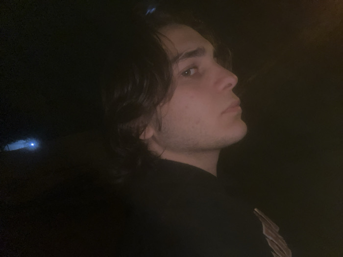 A young adult male is depicted in a medium-close-up portrait, positioned with his body and head turned towards the right side of the frame. He has medium-length, dark, wavy hair and light stubble visible on his chin and jawline. His face is illuminated from the viewer's upper left, creating shadow on his left cheek and neck. His right eye is partially visible, directed slightly upward and to the right. He wears a dark-colored garment, possibly a shirt or hoodie, with a faint, light-colored emblem or design visible on his upper right chest area. The background is predominantly dark, suggesting a low-light environment. A solitary, indistinct blue light source is faintly visible in the far upper-left background. No specific architectural details or geographical features are present to identify a precise location within Tbilisi, Georgia.