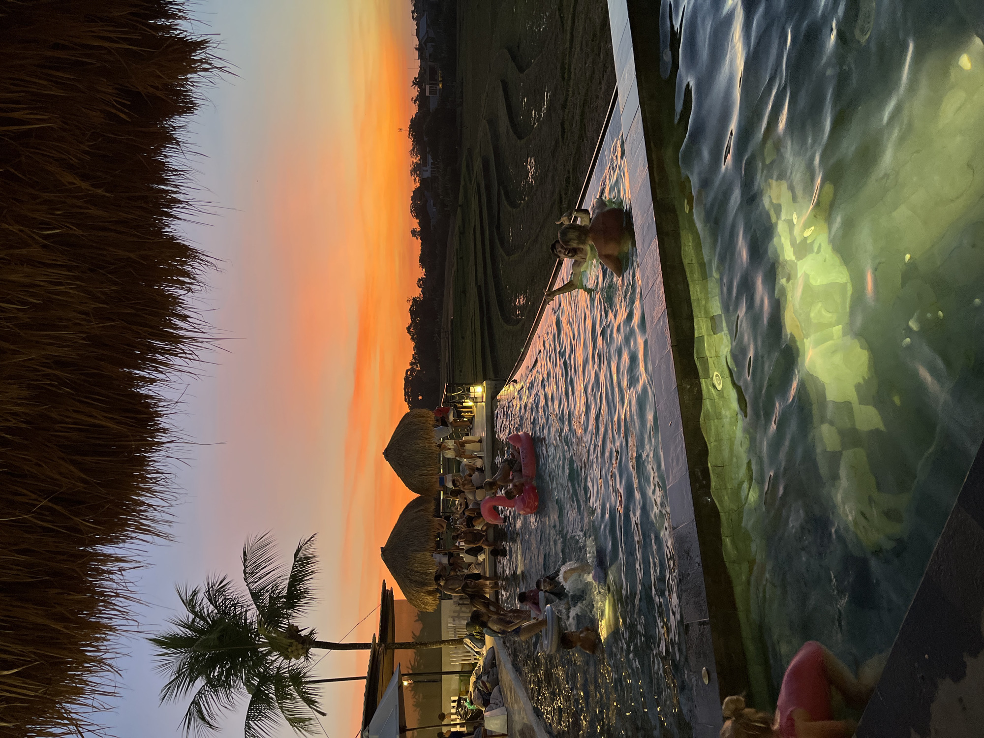 The image captures a dusk scene in North Kuta, Indonesia, showcasing an infinity pool overlooking rice terraces. The sky transitions from blue to orange, indicating sunset. People are swimming and socializing in the pool, with inflatable pink flamingos visible. Several thatch-roofed structures line the pool's edge, where more people are gathered. A palm tree stands near one of the huts. The pool's water reflects the ambient light, creating a rippled effect. In the background, the dark rice terraces stretch out towards the horizon.