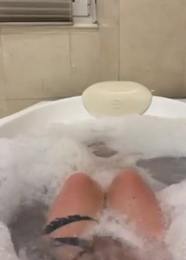 A view looking down into a bubble bath shows a pair of pale legs emerging from the suds. The left foot has a black ankle bracelet. The tub is white and, next to the legs, a bar of soap rests on the lip of the tub. The bathroom has beige tile. A white blind is visible in a window. The legs move slowly and descend further into the water.
