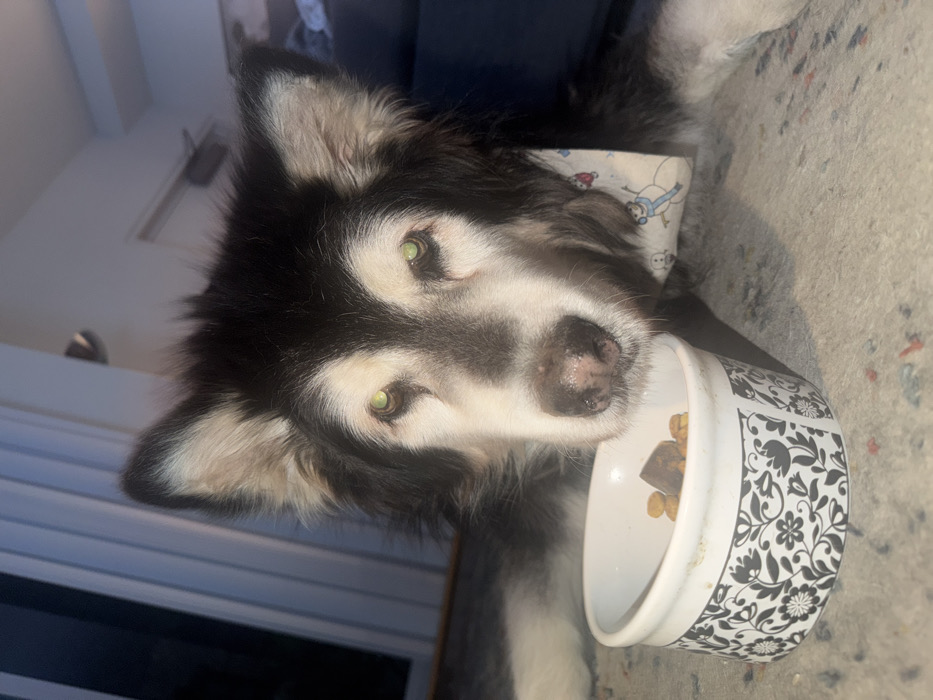 - "A fluffy black and white dog with striking green eyes looks up at the camera" by FM-FHe0a2, licensed under CC BY 4.0
