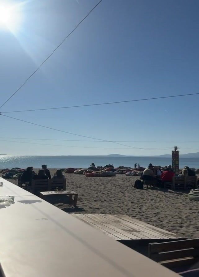 The video pans across a beach in the daytime. The sky is clear and blue, with the sun shining brightly. In the foreground, a table or counter of a beach bar is visible. Further into the shot, people are sitting on beanbag chairs and at wooden tables, enjoying the beach. The beach sand is a tan color. In the distance, the ocean is a shimmering blue, with mountains faintly visible on the horizon. There is some decorative woodwork placed throughout the area and what appear to be volleyball nets further down the beach. There are power lines in the air above the area.