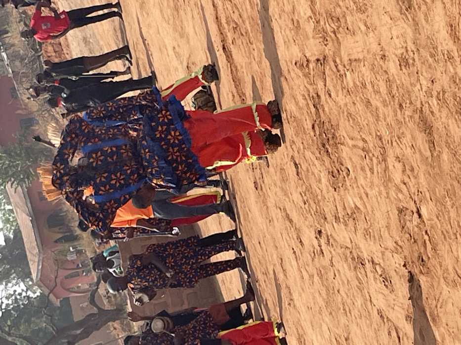 A cultural celebration unfolds with colorfully dressed performers lining a dusty road