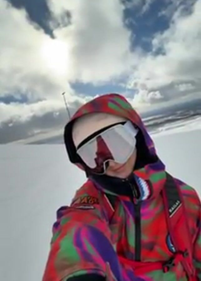 A person wearing a colorful ski jacket, white ski goggles and helmet is taking a selfie on a snowy mountain slope. The jacket has a pattern of red, green, purple, and other colors, and a small patch is visible on the left sleeve. The goggles are large and reflective, and the helmet is a light color. A red backpack is slung over the person's shoulder. In the background, there is a vast, white snowy landscape under a blue sky with scattered clouds and a bright sun. A ski lift pole is visible in the distance on the left. The person raises a gloved hand towards their goggles briefly. The camera is held at an upward angle.