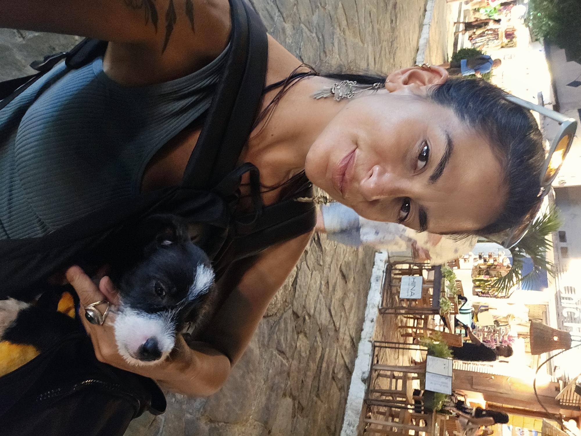 A medium shot shows a woman holding a black and white puppy. She has dark hair pulled back and dark eyes. She is wearing a gray ribbed tank top. The puppy has fluffy white fur on its face. The background includes a stone-paved street, outdoor seating for a restaurant, and a street scene with pedestrians and shops, typical of the city of Armação dos Búzios, Brazil.