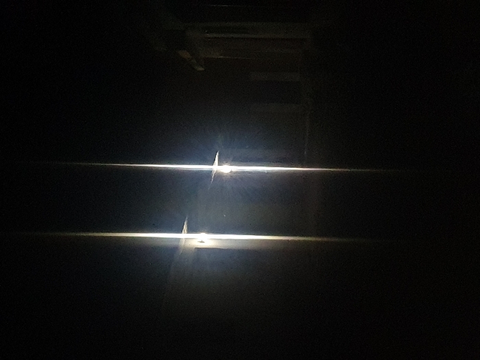 The image presents a dark interior with two horizontal slits of intense light. The light sources, obscured by the slits, produce starburst-like flares. Above the slits, darker forms suggest a ladder or ceiling structure, nearly lost in the shadows. The overall effect is one of stark contrast and obscured visibility.