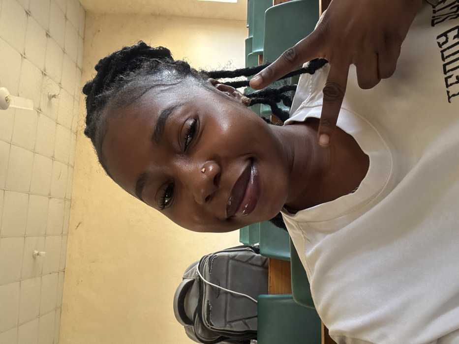 An indoor photograph, taken in Rafin Par, Nigeria, features a young female subject. She exhibits dark skin, dark dreadlocked hair pulled back, and wears a white crew-neck t-shirt. Her facial expression shows a slight smile, with prominent eyelashes, dark plum-colored lip gloss, a small gold stud piercing on her right nostril, and a small stud earring in her right earlobe. Her right hand is raised, displaying a two-fingered V-sign gesture. The background indicates a classroom or lecture hall setting, characterized by multiple rows of green-backed chairs with light-colored bases, a light tan wall, and a tiled ceiling with a visible white ceiling fan. A grey backpack with a white cord draped over it rests on a chair to the subject's left.