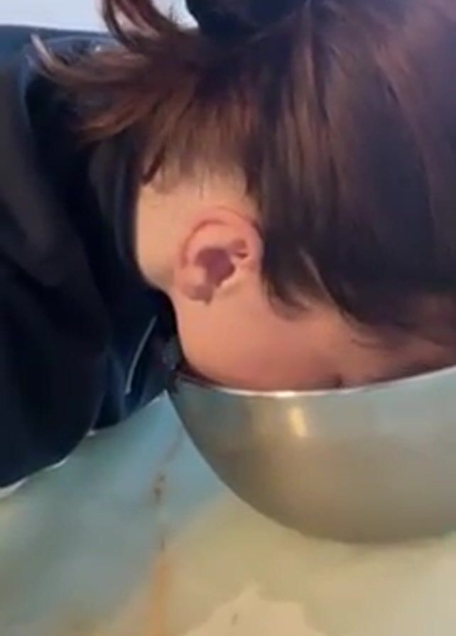 A young woman with brown hair, partially tied up in a bun, is seen up close, leaning over a silver mixing bowl filled with water and several ice cubes. She immerses her face in the cold water, then emerges, her face wet and glistening. The bowl is sitting on a marbled surface. In the background, there is a glimpse of a room with a plant, shelves, and a sofa.