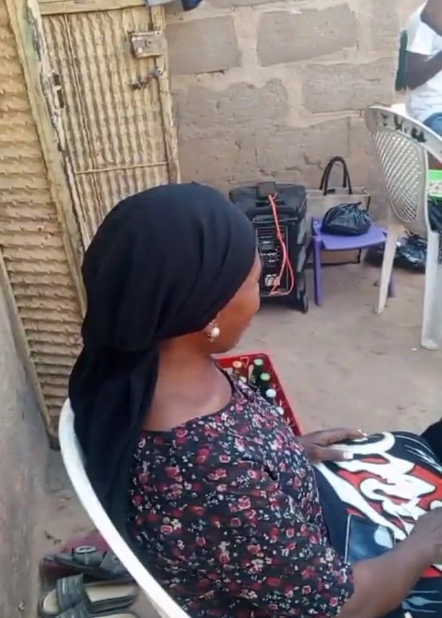 woman in a black headscarf and floral top sitting in a white plastic chair. She has a box of beverages next to her. A man sitting across from her, wearing a white t-shirt and jeans, is using a tool, possibly a needle, on her hand. The woman is smiling and appears to be relaxed. Other people are standing around, some watching the scene. The environment appears to be an outdoor area, possibly a backyard, with a brick wall and other chairs visible. The man wearing the white shirt is laughing.