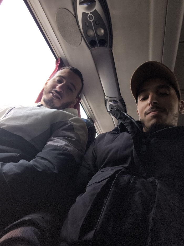 The image captures two adult males seated within the passenger compartment of a public transportation vehicle, likely a bus or coach, presumptively located in Meknes, Morocco