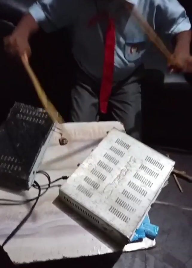 A young boy in a school uniform is playing a makeshift drum set made of two rectangular metal boxes and a white block, placed on a low white platform on the floor