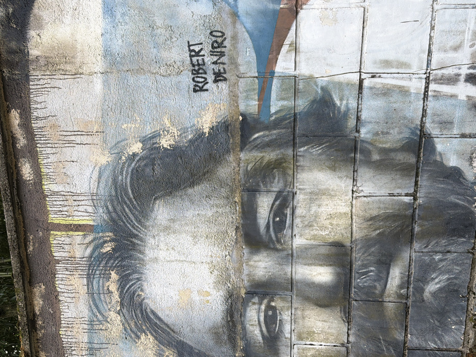 A vertical image captures a weathered mural of a man's face on a textured concrete block wall in Grad Opatija, Croatia. The wall consists of large, rectangular, light-grey segments with prominent mortar lines, showing signs of dirt, discoloration, and significant paint loss. Dark vertical streaks, possibly water or rust stains, run down from a dark, rough horizontal band at the top edge of the wall, above which sparse green foliage is visible. The mural, rendered in grayscale and muted blue tones, depicts the upper portion of a male face with dark, medium-length hair swept back, visible eyes, nose, and the upper part of a beard. The name "ROBERT DE NIRO" is stenciled in black uppercase letters on the upper right portion of the mural, over the subject's forehead area. A small, abstract blue and brown design is present to the right of the face, near the eye level.