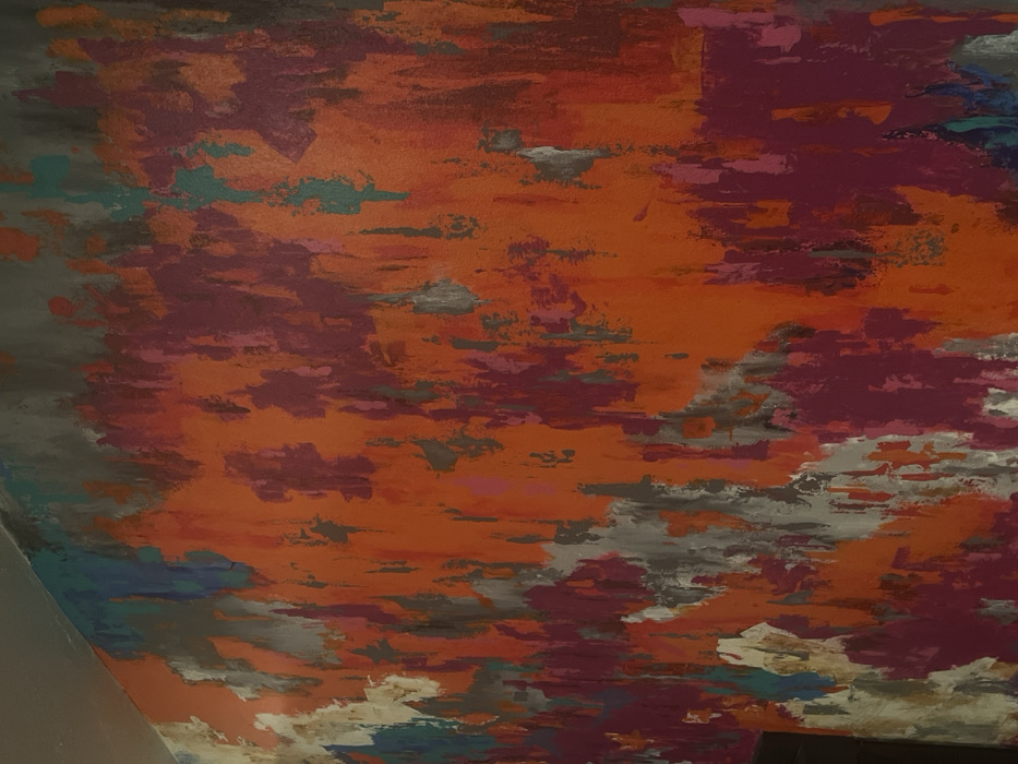The image displays an interior wall covered with an abstract mural or paintwork