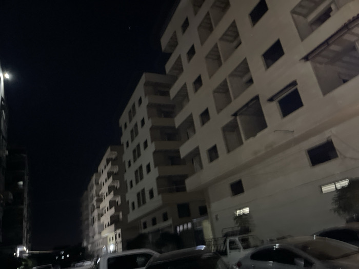 Three tall, pale buildings line a dark street. The structures have many open windows or empty spaces where windows should be. Several parked cars are visible at street level. A streetlight shines on the leftmost building, while the sky is a dark, clear night. The image has a slightly grainy or blurry quality.
