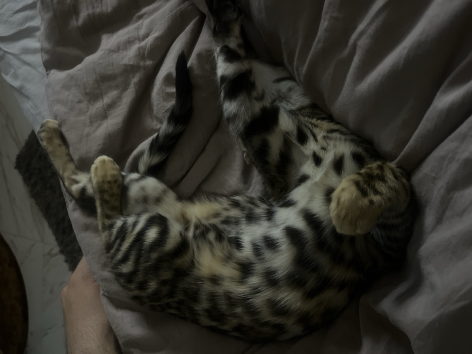 The image depicts an indoor scene in Krushare, Bulgaria. A spotted and marbled domestic cat, predominantly tan and dark brown, lies on its back, curled, with all four paws and its dark-tipped tail visible. The cat rests on light brown/taupe bedding, which appears wrinkled. A partial human forearm and hand, fair-skinned, are visible to the cat's left, also resting on the bedding. A blurred dark, textured object, likely a rug, is visible on a lighter surface in the background. The environment is dimly lit.