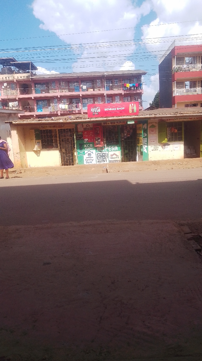 A street scene featuring a row of storefronts with various advertisements. The storefronts include signage for "Bennas Shop," Coca-Cola, and banking/agent services. Above the storefronts, there are multi-story buildings with apartments or residential units. The sky is partly cloudy. A person in a blue dress is partially visible on the left side of the image. The street is in shadow and occupies a large portion of the frame.