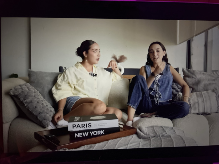 The scene depicts two young adult females seated on a light-colored, textured sofa in an indoor setting. The specific location within Toluca, Mexico, is not discernible from the visual information provided; however, the room appears to be a modern living space or studio. The female on the left wears a light yellow button-down shirt over denim shorts, with her dark hair pulled back. A small black microphone is clipped to her shirt. She is observed with her mouth open, appearing to speak, and holds a small, light brown, feathery object in her right hand, which is slightly raised. The female on the right wears a denim sleeveless top with a lace-up front and dark blue jeans. Her dark hair is down. A small black microphone is clipped to her top. She is also observed with her mouth open, appearing to speak, and gestures with her left hand, which holds a small, dark object. A dark-colored watch or bracelet is visible on her left wrist. Between the two females, on the sofa cushion and partially on the armrest, rests a dark brown wooden tray. On the tray, a stack of three decorative books is visible. The top book is black with "PARIS" in white text, the middle book is white with "PARIS" and "NEW YORK" in black text, and the bottom book is black with "NEW YORK" in white text. Various pillows are arranged on the sofa: a grey textured pillow with circular protrusions behind the left female, and a striped grey and white pillow behind the right female. A textured grey blanket is draped over the sofa on the right side. A small white vase containing light brown, feathery dried plants is positioned behind the left female's head. The background consists of a plain light-colored wall and a window or glass panel with a light-colored blind or shade. The presence of clip-on microphones suggests a recording or broadcast is taking place.