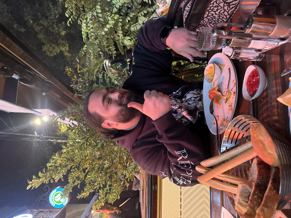 The image depicts an outdoor nighttime dining scene at a Coffeeshop Company in Yerevan, Armenia. A male individual, mid-shot, occupies the central frame, seated at a rustic wooden table. He has dark hair, a full beard, and is wearing a dark hooded sweatshirt featuring a monochromatic graphic on the chest and white stylized text on the left sleeve, possibly reading "REPLICA" in reverse. He is smiling and extends his right hand with a prominent thumbs-up gesture. A dark smartwatch is visible on his left wrist. On the table in front of him, a silver basket contains various bread items, including several long breadsticks and slices of dark bread. To the right, a white oval plate holds remnants of a partially consumed meal, appearing to be fried chicken or schnitzel, along with a fork and spoon. Accompanying condiments include a small white bowl of red sauce (ketchup) and another small white bowl containing small yellow items, possibly fries or cheese curds. A clear glass of water and a metal condiment caddy with shakers are also present. A black and white patterned bag is partially visible to the far right. The background features lush green foliage, illuminated by artificial light, suggesting an urban street-side or terrace setting. In the upper left quadrant, a circular blue and green neon sign clearly displays "COFFEESHOP COMPANY." Distant, blurry figures are seated at other tables, indicating an active outdoor dining area, and overhead streetlights are visible.