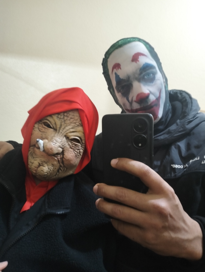 Two people are posing in costumes. On the left is someone wearing an old woman mask with a red hood and a cigarette in their mouth. On the right, a person is in Joker makeup with green hair. They are wearing black jackets. The Joker is holding a black smartphone as if taking a selfie. The background is a plain, light-colored wall.