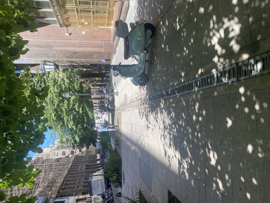 This image depicts a sunny urban street scene in Buenos Aires, Argentina, specifically in front of the Academia Nacional de la Historia located at Balcarce 139, Montserrat. The scene is observed from a slightly elevated perspective, looking down a wide paved pedestrian area lined with trees. The environment is brightly lit by natural sunlight, casting distinct dappled shadows from overhead tree foliage across the light grey paver sidewalk. A long, recessed metal grate drainage channel extends longitudinally down the center of the paved area from the foreground towards the background. On the immediate right, a light mint green retro-style scooter with a tan seat and matching rear top case is parked on its kickstand. The brand "SUZUKI" is visible on its side panel, and a partially legible license plate (A 559) is affixed to its rear. Behind the scooter stands a black traditional street lamp post. Adjacent to this, the facade of the Academia Nacional de la Historia is visible, characterized by reddish-brown marble or granite, featuring prominent, ornate golden double doors with "ACADEMIA NACIONAL DE LA HISTORIA" inscribed on the architrave above them. A person wearing blue is partially visible behind the lamp post. On the left side of the paved area, a male individual is walking away from the viewer, towards the background. He wears a light blue short-sleeved collared shirt, light trousers, and dark shoes, carrying a dark bag over his right shoulder. Further down this side, a classical multi-story building with a stone facade and numerous windows is visible. Several motorcycles and scooters are parked along the curb near this building, and a white flatbed truck with a blue tarp covering its cargo area is also visible parked further down the street. Planter beds with green foliage and light-colored stone benches are interspersed along the left pedestrian path. The far background shows more urban buildings under a clear blue sky.