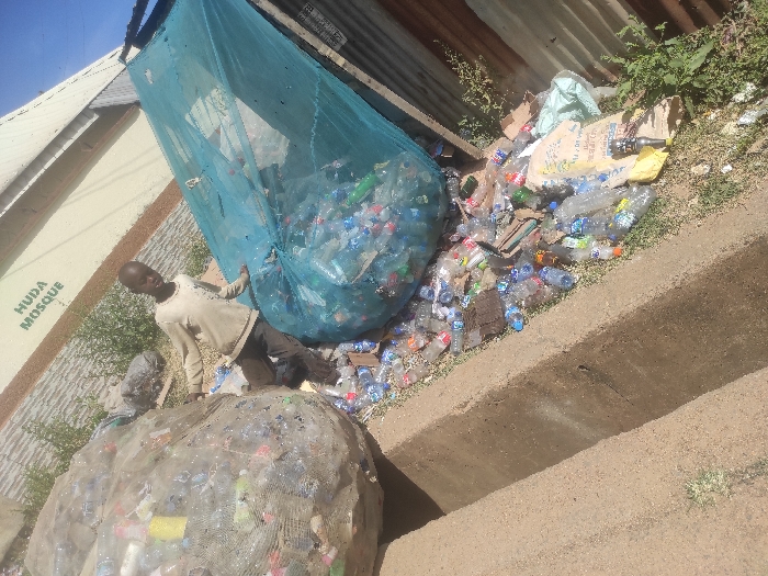 This image depicts an outdoor scene in Jos, Nigeria, featuring a young male amidst a substantial collection of plastic waste, with the "HUDA MOSQUE" visible in the background