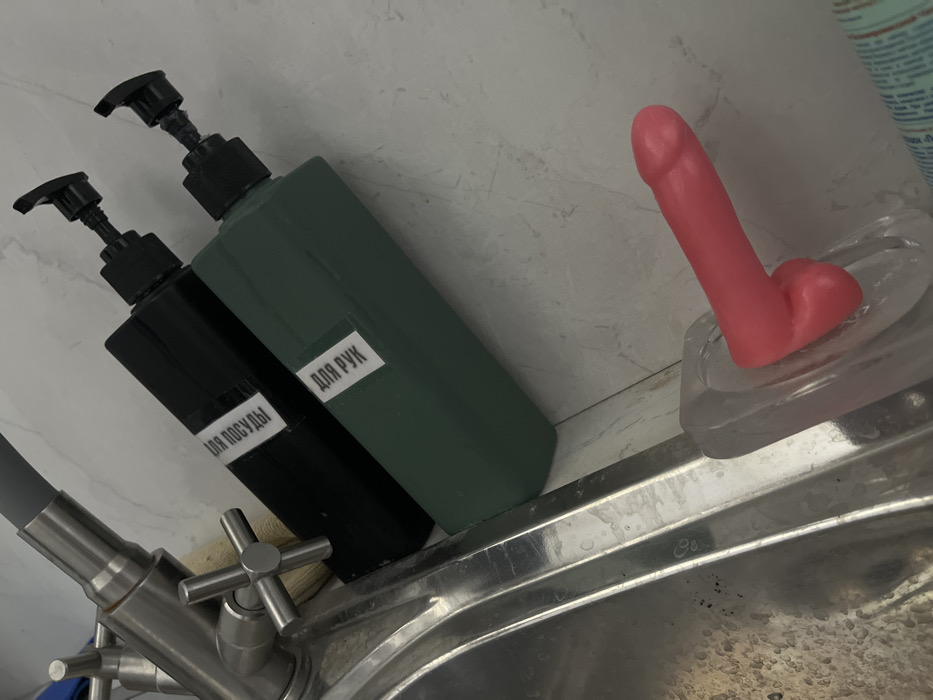 A close-up photograph depicts a kitchen sink area in what appears to be a residential or utility space in Ovoshchnoy, Russia. The scene is dominated by a stainless steel sink basin, visible on the left with evident water marks and some residue. A chrome-plated faucet, featuring two cross-shaped handles and a flexible pull-out spray hose, is positioned above the sink. Resting against a light-colored, possibly tiled or stone-patterned, wall surface behind the sink are two rectangular pump dispenser bottles. The bottle on the left is black and features a white label with Cyrillic text reading "ДЛЯ ПОСУДЫ" (FOR DISHES). The bottle on the right is dark green and bears a white label with Cyrillic text reading "ДЛЯ РУК" (FOR HANDS). To the right, prominently displayed, a bright pink, phallic-shaped silicone dildo stands upright within a clear, transparent holder. This holder appears to be affixed to the countertop or sink edge. A small, light-colored cloth or sponge is visible near the base of the faucet. A blue and white object, possibly a cleaning product bottle, is partially visible in the bottom right corner. No individuals are present in the image.