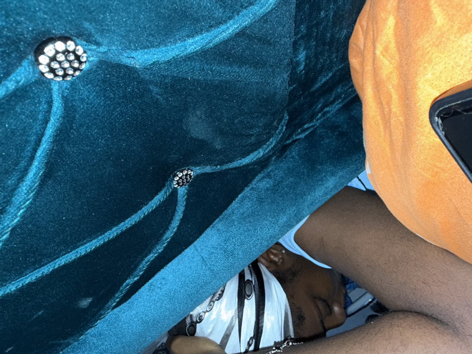The image depicts a person lying beneath a teal velvet cushion featuring decorative buttons. The individual's face is partially visible, covered in a white and black patterned fabric. They are wearing a light blue garment. An orange fabric item rests beside the person's arm, and a black smartphone is placed atop it. The scene appears to be taken in a dimly lit environment.