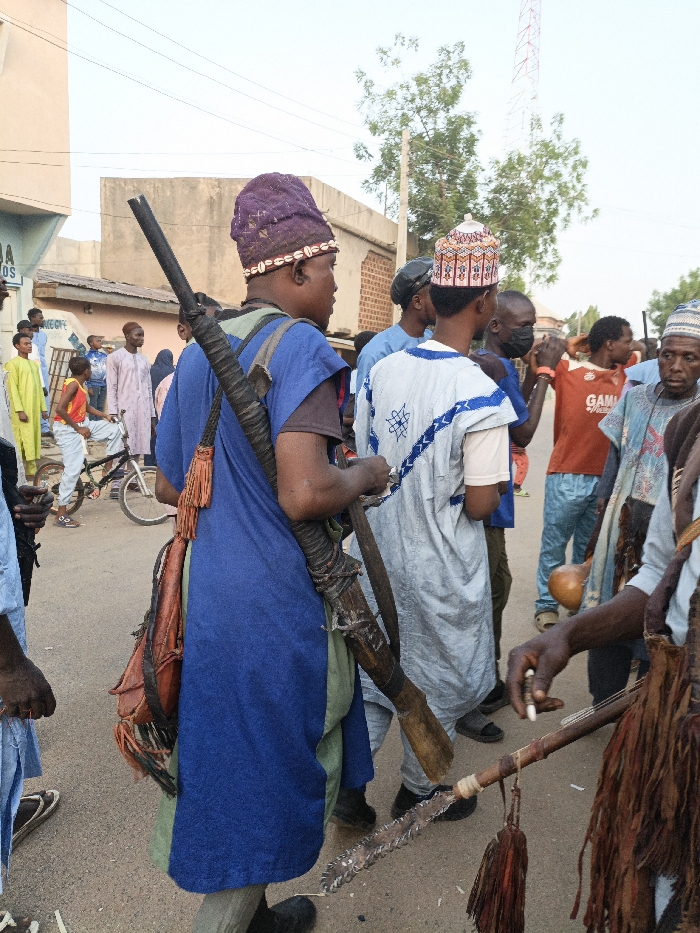 A street scene features several individuals, most wearing traditional attire. A man in a blue tunic and purple hat adorned with shells carries a long rifle strapped to his back. Another man wears a patterned white and blue robe. A gourd and musical instrument appear nearby. Other men wear colorful shirts, hats, and robes. Buildings, trees, and a cell tower are in the background.