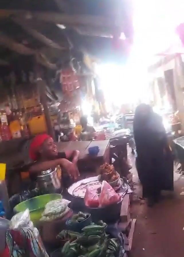 bustling market scene, likely in an African country, filled with vendors selling various goods. The camera moves through the narrow aisles between the stalls. In the foreground, a woman with a red headscarf is seen smiling behind her vegetable stand, which displays okras, tomatoes, and other items. Other vendors sit at their tables, waiting for customers. One woman in a black robe passes by. The stalls are under a corrugated metal roof that lets in sunlight. The tables are cluttered with produce, bowls, and other objects.