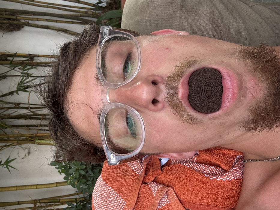 A person with glasses lying on their back has an Oreo cookie in their mouth. The individual has short brown hair and a beard. An orange towel rests around their neck. A silver chain is also visible. Bamboo stalks are in the background, along with some greenery. The person's face is the main focus of the image.